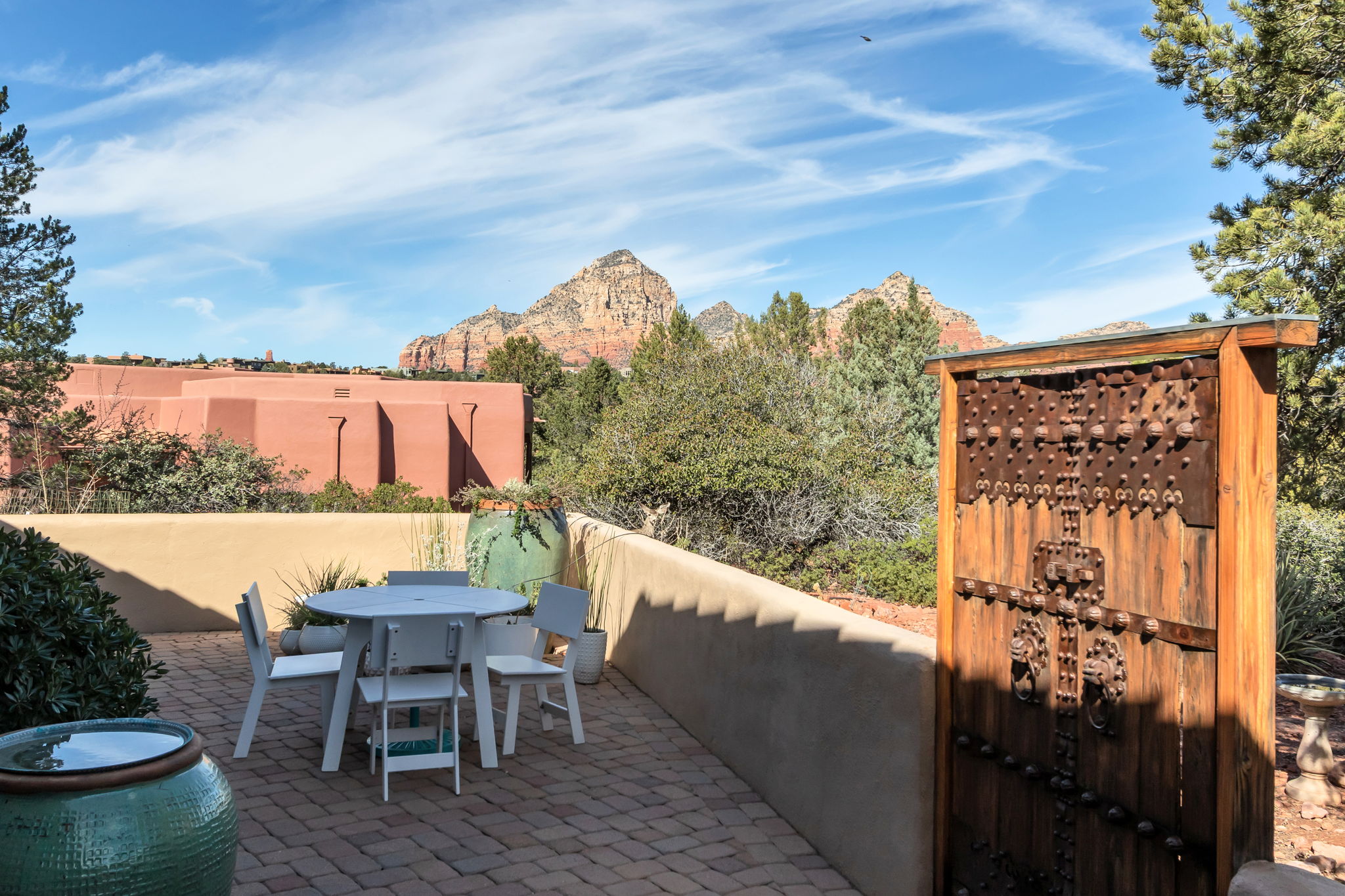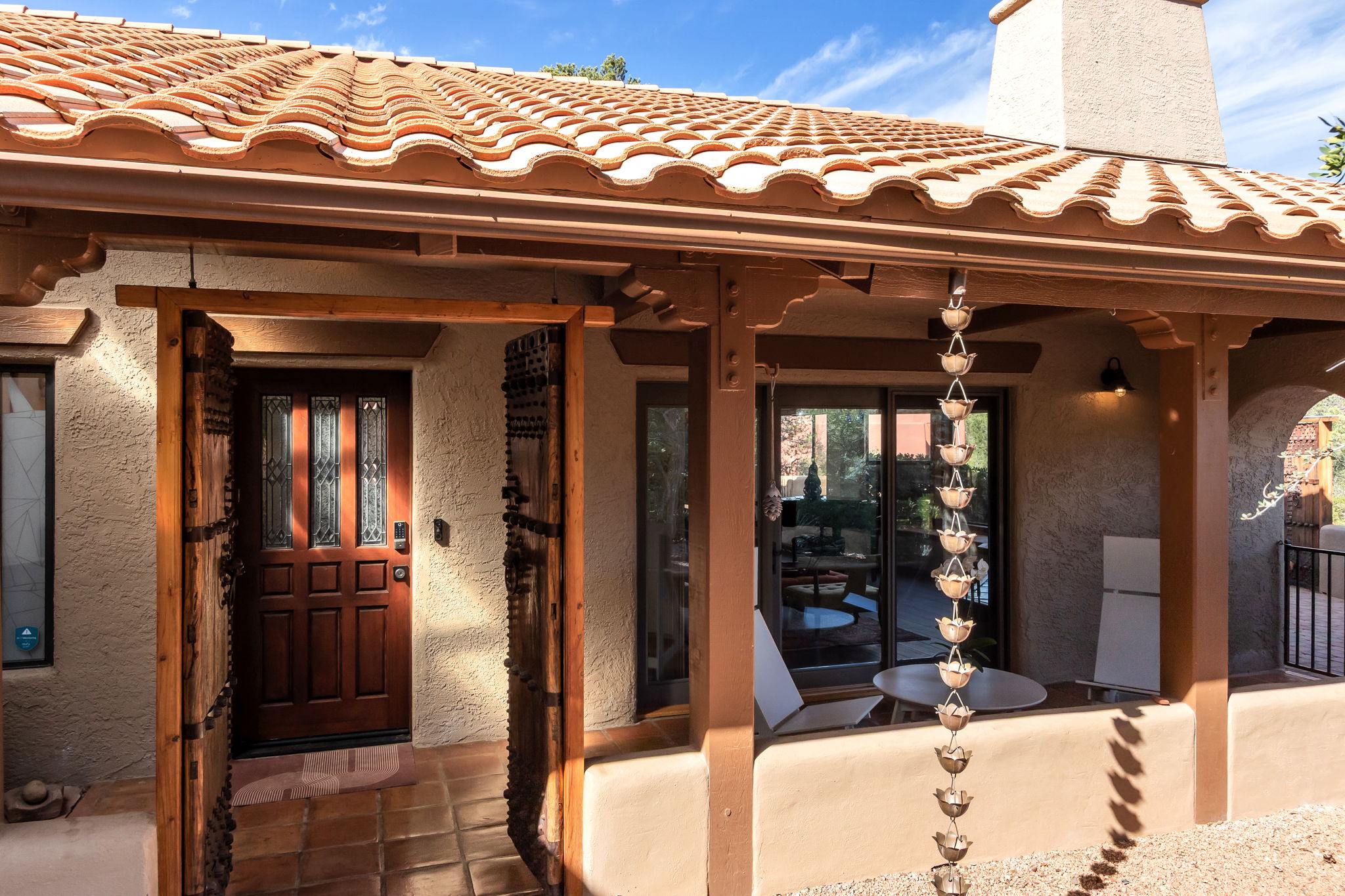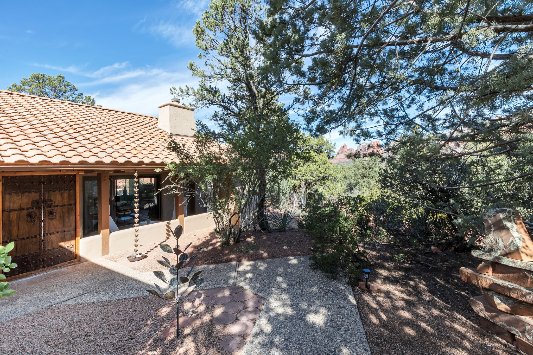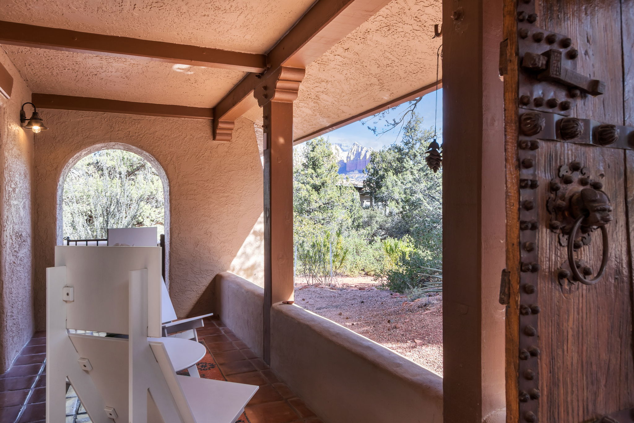 Located in Sedona’s coveted Rolling Hills Estates, 45 Kashmir Rd. offers a lifestyle defined by sweeping Red Rock views, privacy, and authentic Southwest character. From its elevated position among the rolling terrain for which the neighborhood is named, the home captures panoramic vistas of Sedona’s iconic monolithic landscape–creating a daily backdrop that is both inspiring and serene. Arrival sets an immediate sense of welcome. A covered front portico invites peaceful mornings with coffee and relaxed evenings cooled by gentle desert breezes, while the home’s distinctive entry–showcasing exotic wood doors crafted from thick planks and bound with hand-forged iron–reflects exceptional craftsmanship and enduring style. Inside, the residence opens with warmth and architectural character, highlighted by soaring ceilings with exposed wood beams and beautifully tiled floors that create a rich, timeless blend of Contemporary Southwest ambiance.