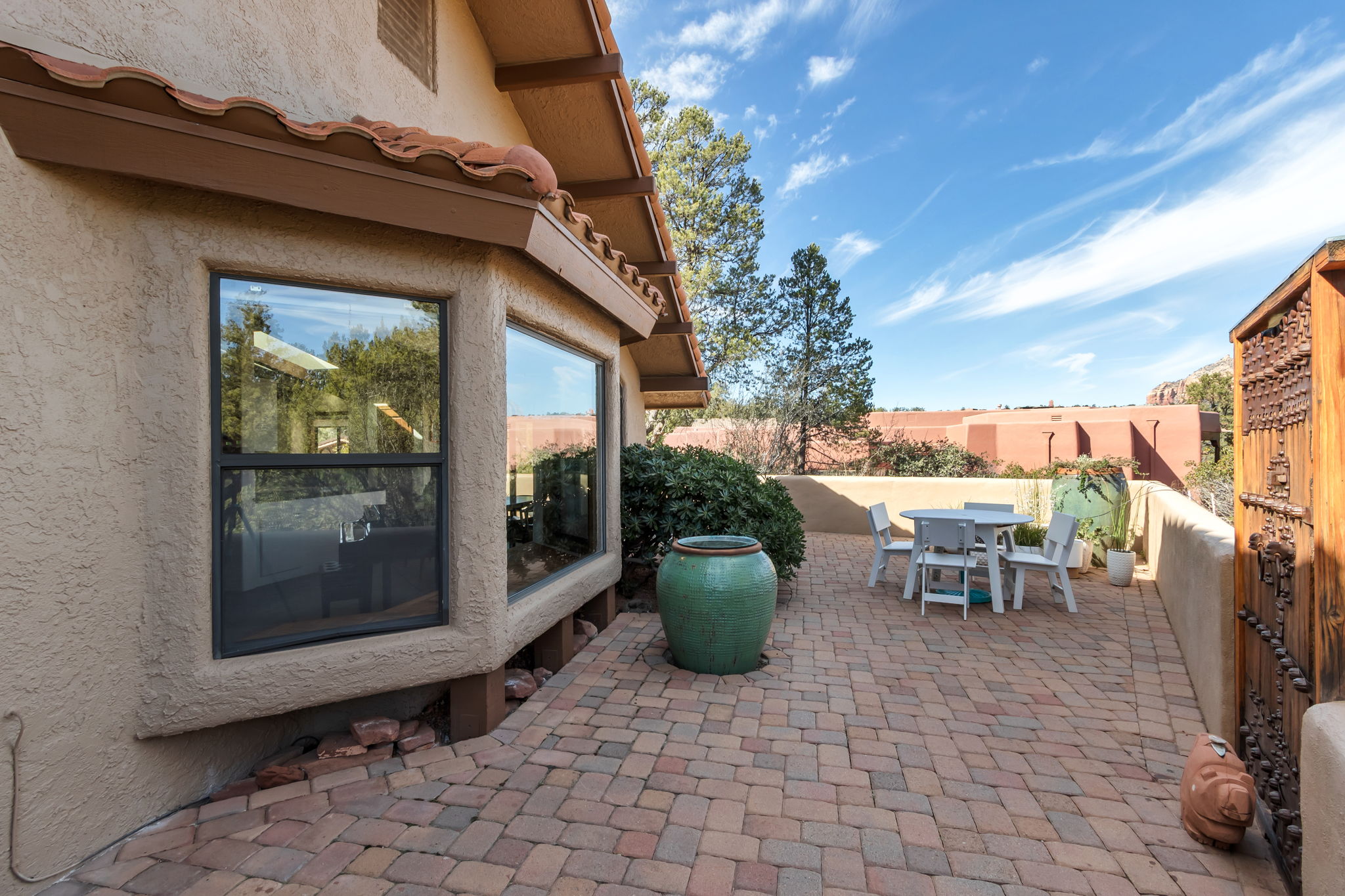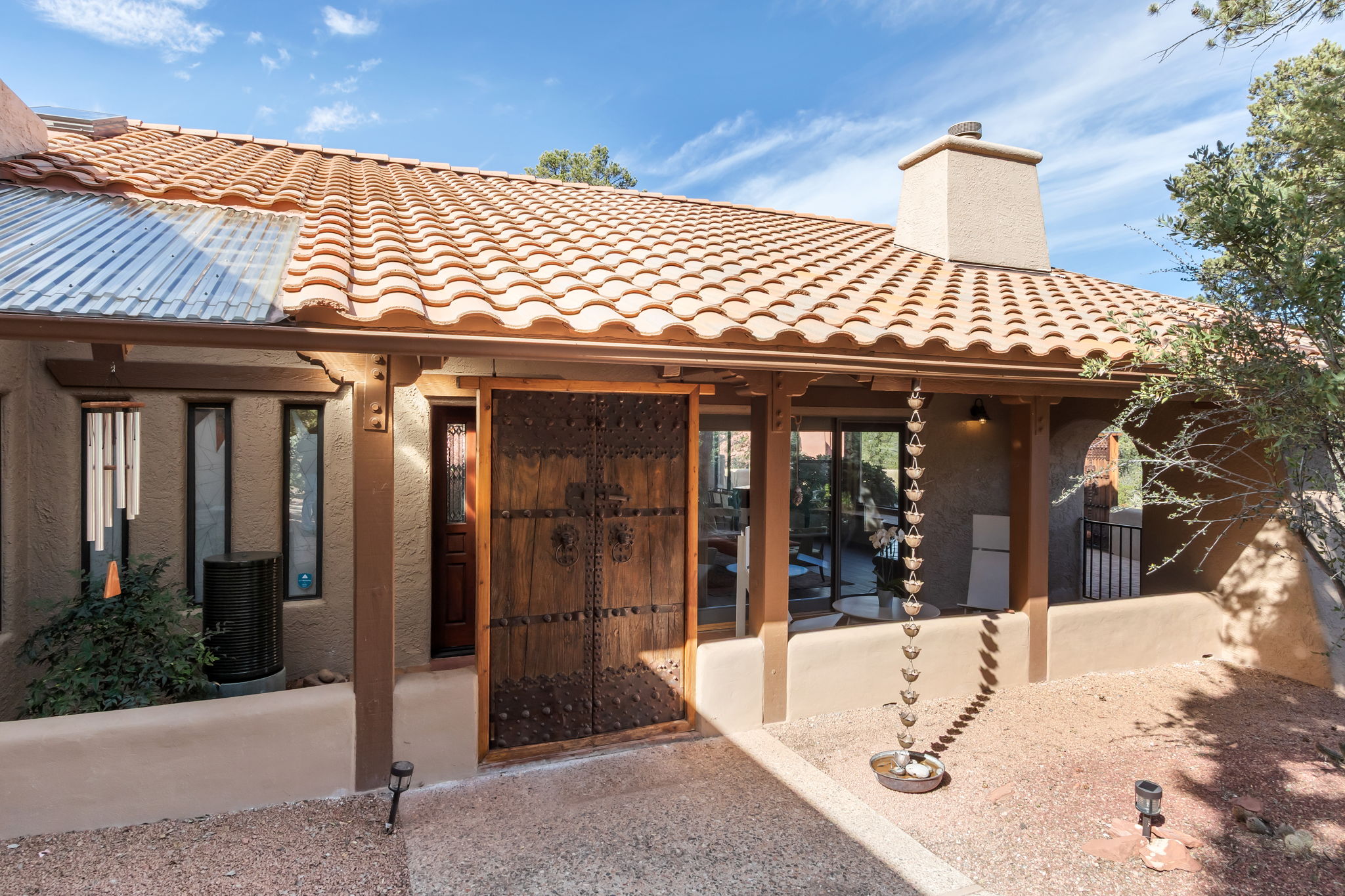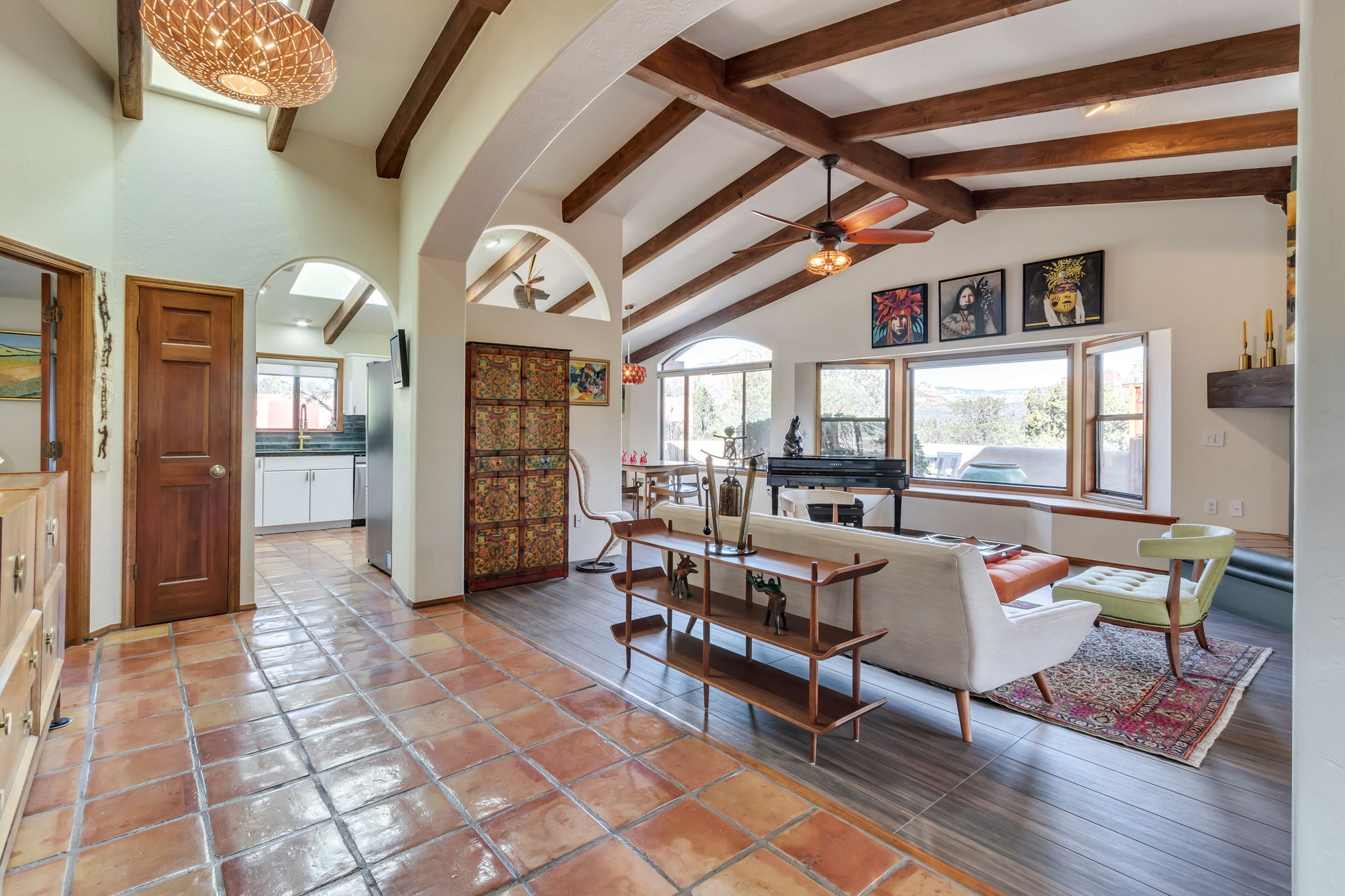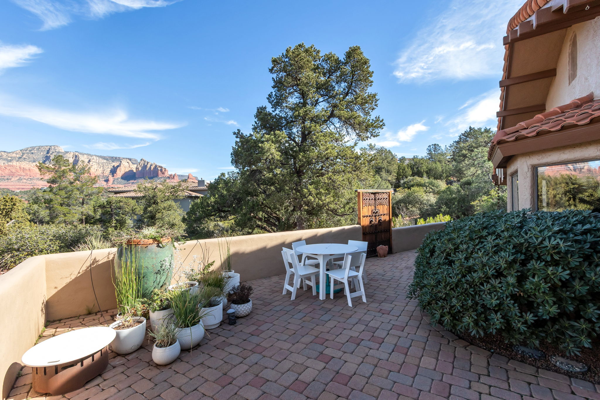 Located in Sedona’s coveted Rolling Hills Estates, 45 Kashmir Rd. offers a lifestyle defined by sweeping Red Rock views, privacy, and authentic Southwest character. From its elevated position among the rolling terrain for which the neighborhood is named, the home captures panoramic vistas of Sedona’s iconic monolithic landscape–creating a daily backdrop that is both inspiring and serene. Arrival sets an immediate sense of welcome. A covered front portico invites peaceful mornings with coffee and relaxed evenings cooled by gentle desert breezes, while the home’s distinctive entry–showcasing exotic wood doors crafted from thick planks and bound with hand-forged iron–reflects exceptional craftsmanship and enduring style. Inside, the residence opens with warmth and architectural character, highlighted by soaring ceilings with exposed wood beams and beautifully tiled floors that create a rich, timeless blend of Contemporary Southwest ambiance.