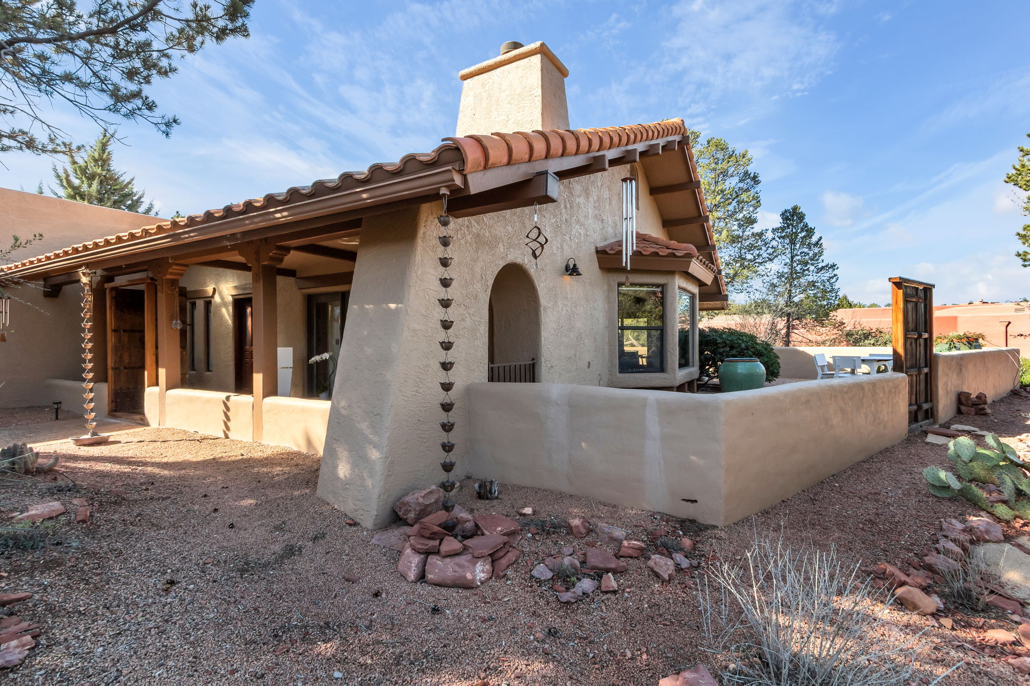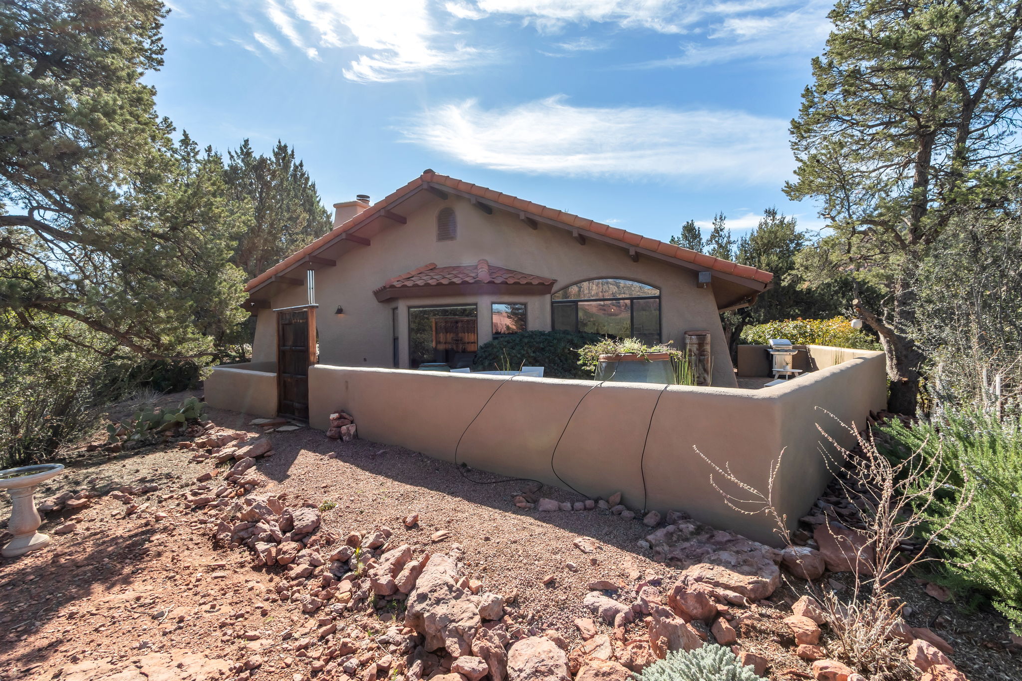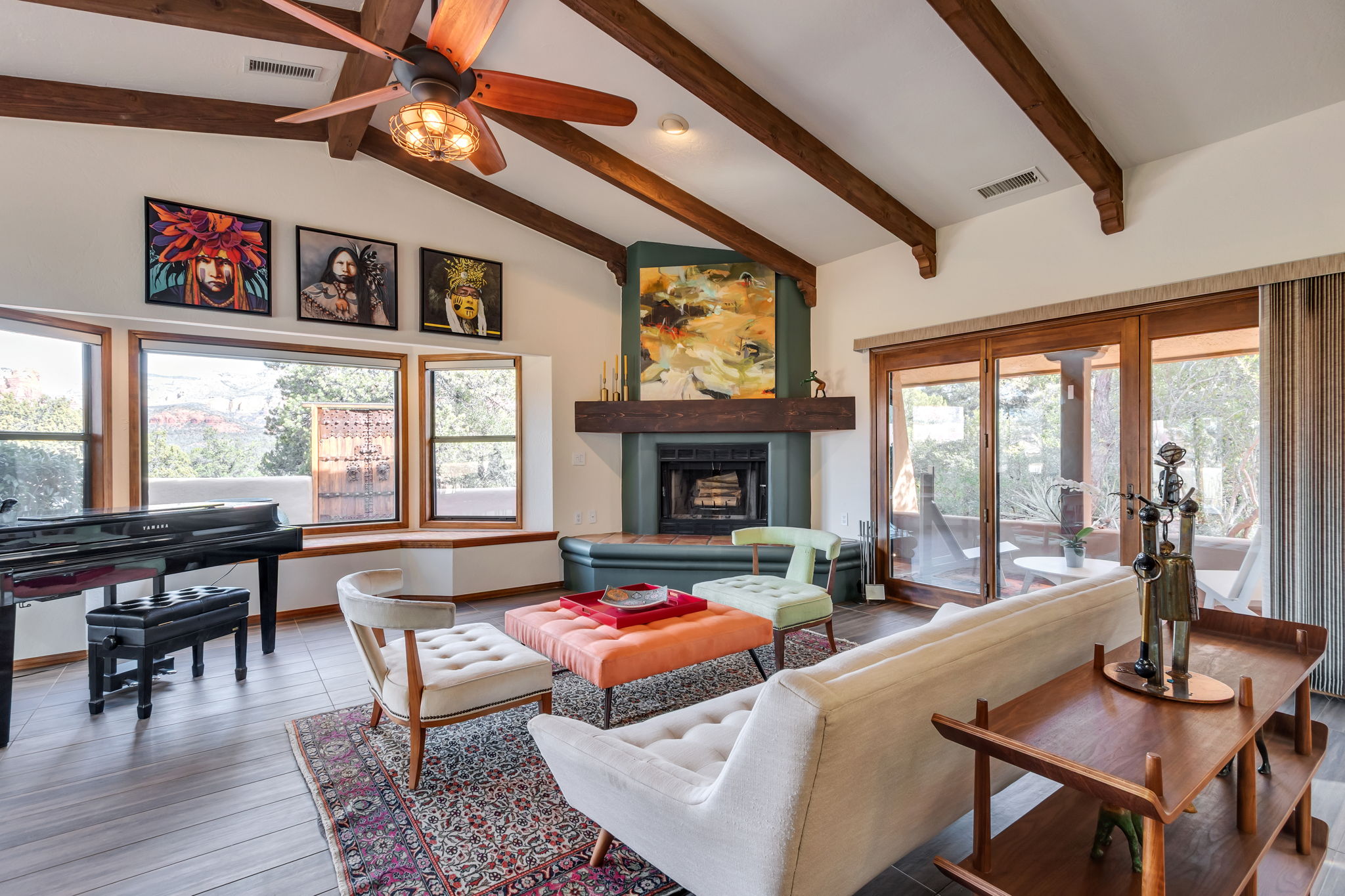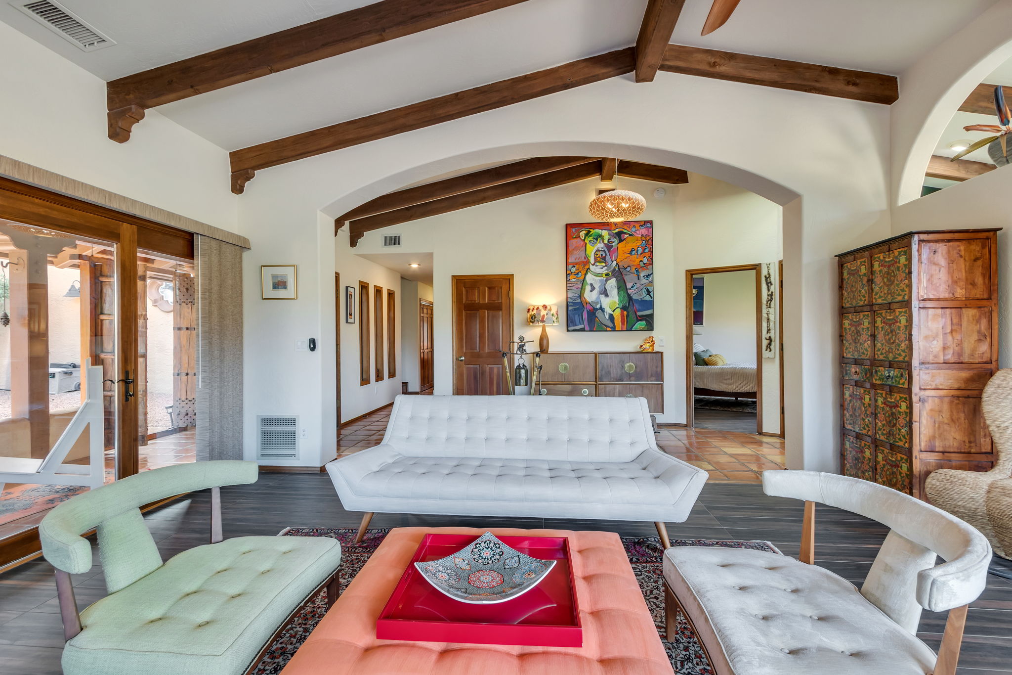 Located in Sedona’s coveted Rolling Hills Estates, 45 Kashmir Rd. offers a lifestyle defined by sweeping Red Rock views, privacy, and authentic Southwest character. From its elevated position among the rolling terrain for which the neighborhood is named, the home captures panoramic vistas of Sedona’s iconic monolithic landscape–creating a daily backdrop that is both inspiring and serene. Arrival sets an immediate sense of welcome. A covered front portico invites peaceful mornings with coffee and relaxed evenings cooled by gentle desert breezes, while the home’s distinctive entry–showcasing exotic wood doors crafted from thick planks and bound with hand-forged iron–reflects exceptional craftsmanship and enduring style. Inside, the residence opens with warmth and architectural character, highlighted by soaring ceilings with exposed wood beams and beautifully tiled floors that create a rich, timeless blend of Contemporary Southwest ambiance.