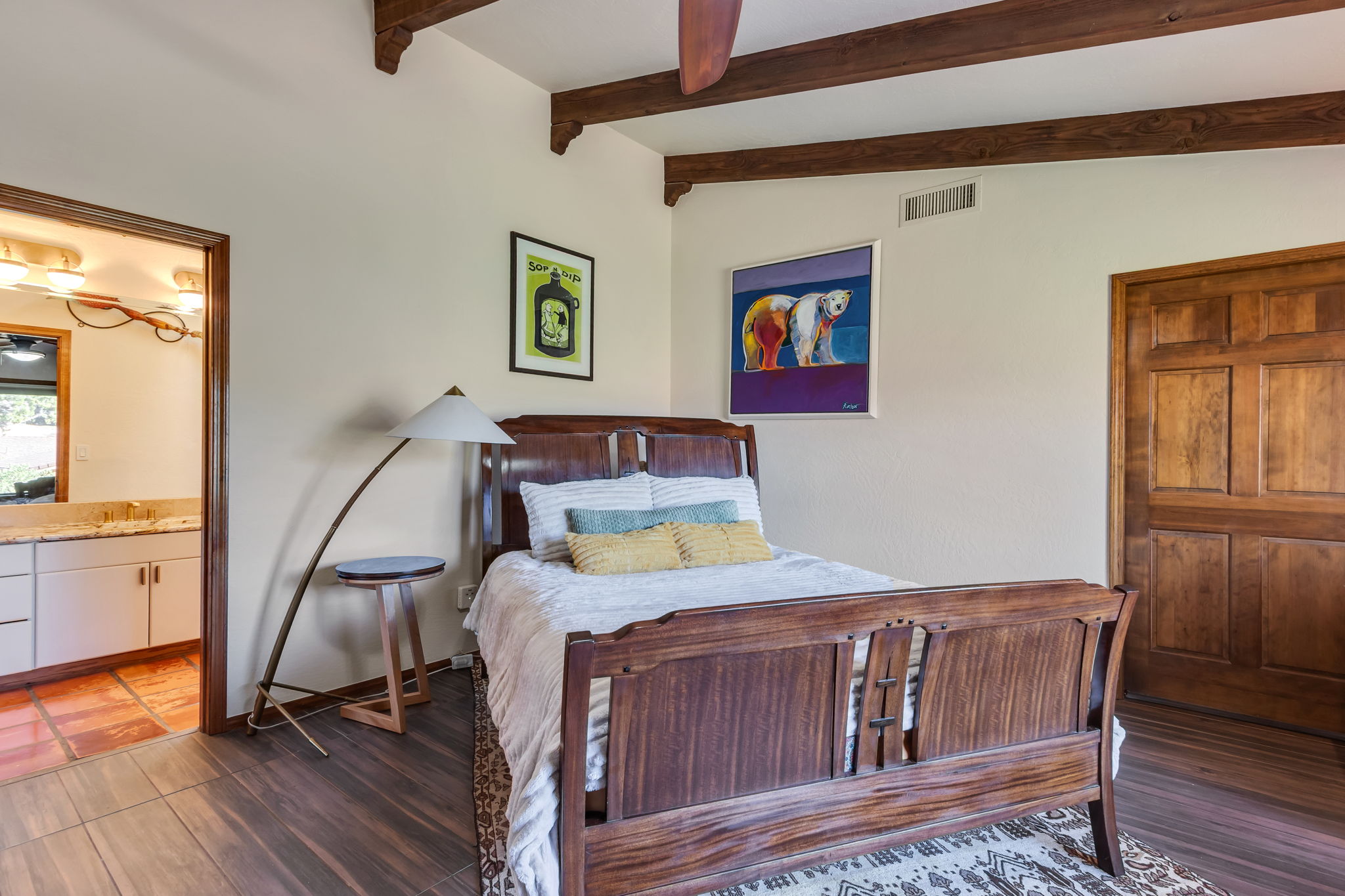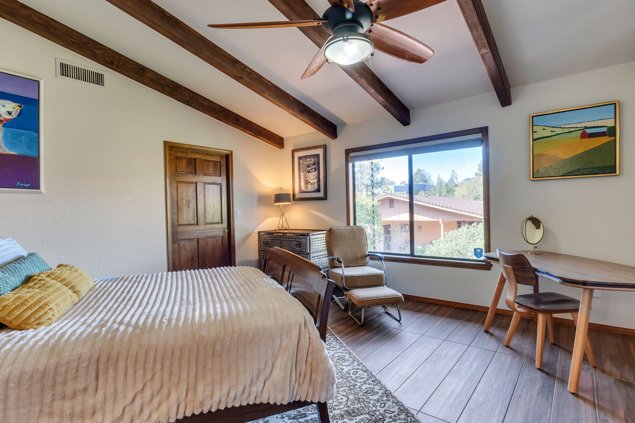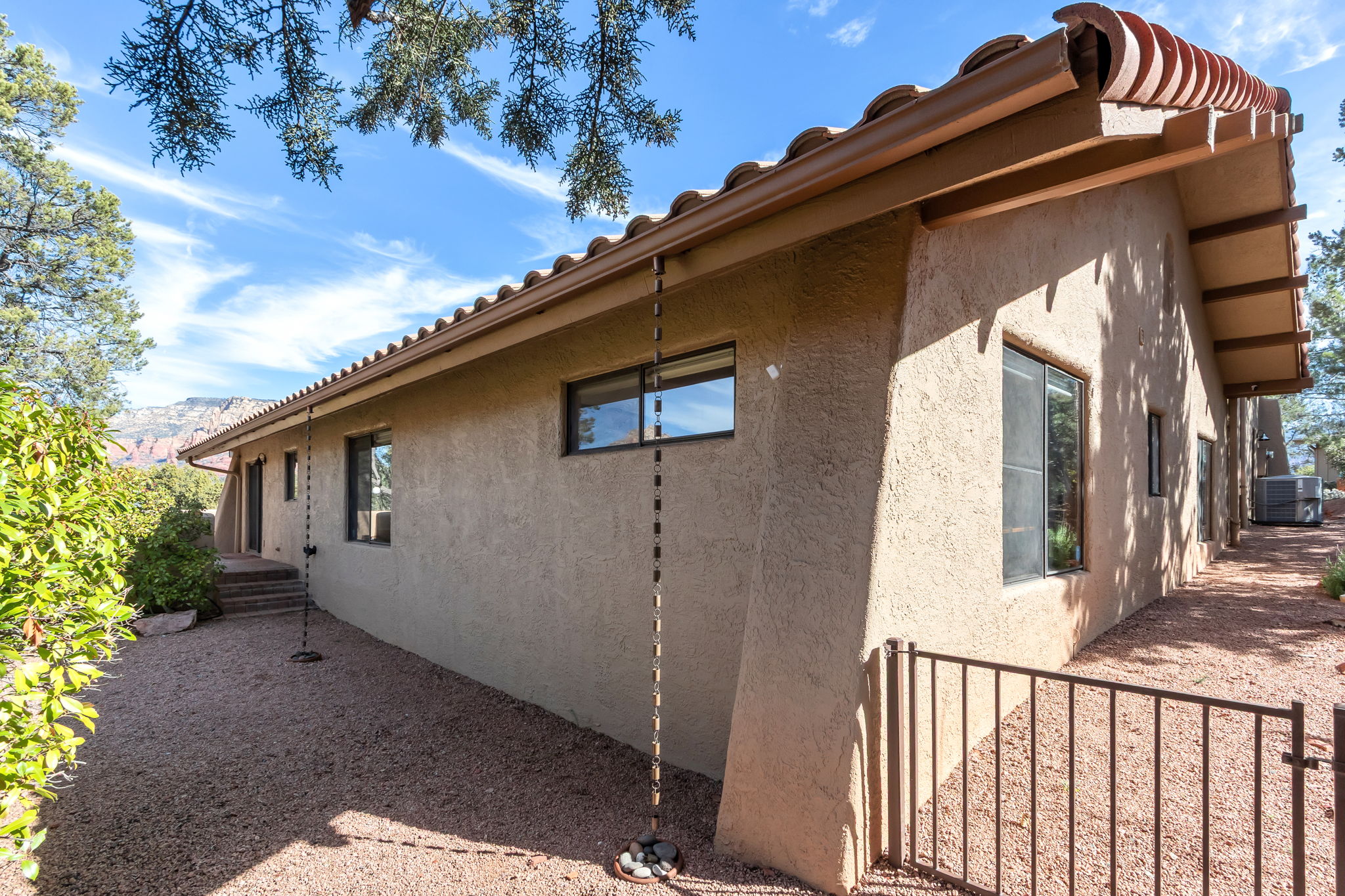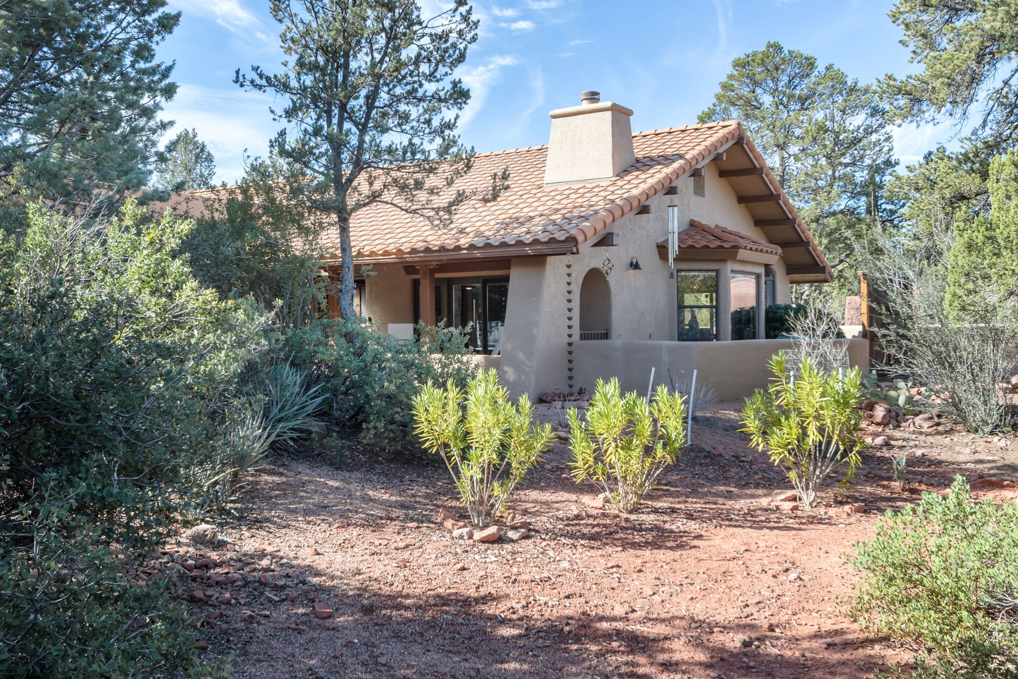 Located in Sedona’s coveted Rolling Hills Estates, 45 Kashmir Rd. offers a lifestyle defined by sweeping Red Rock views, privacy, and authentic Southwest character. From its elevated position among the rolling terrain for which the neighborhood is named, the home captures panoramic vistas of Sedona’s iconic monolithic landscape–creating a daily backdrop that is both inspiring and serene. Arrival sets an immediate sense of welcome. A covered front portico invites peaceful mornings with coffee and relaxed evenings cooled by gentle desert breezes, while the home’s distinctive entry–showcasing exotic wood doors crafted from thick planks and bound with hand-forged iron–reflects exceptional craftsmanship and enduring style. Inside, the residence opens with warmth and architectural character, highlighted by soaring ceilings with exposed wood beams and beautifully tiled floors that create a rich, timeless blend of Contemporary Southwest ambiance.