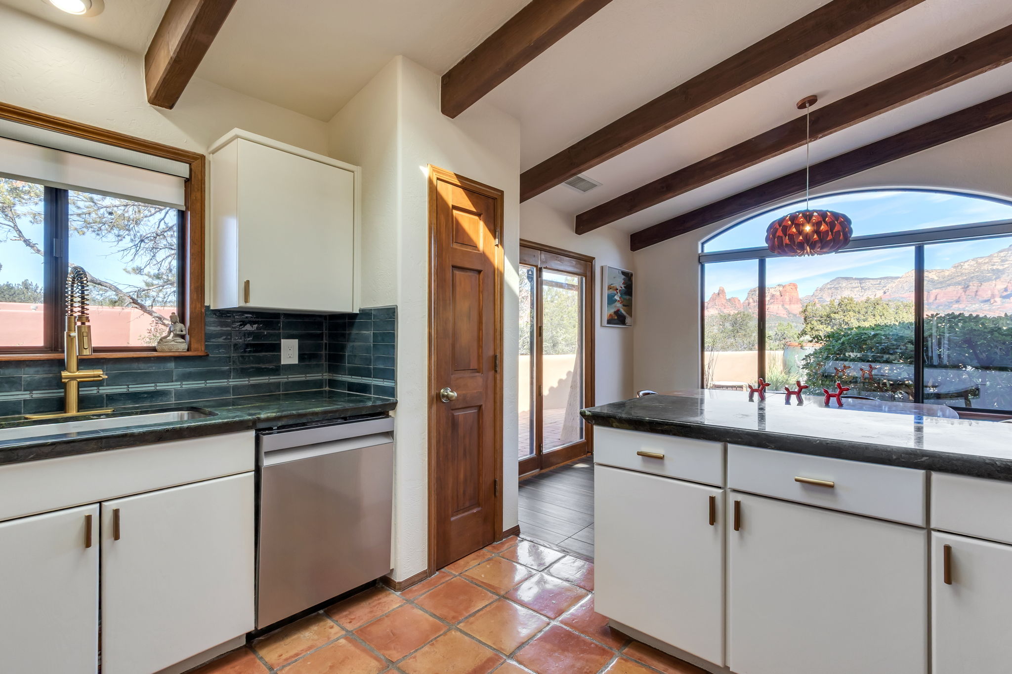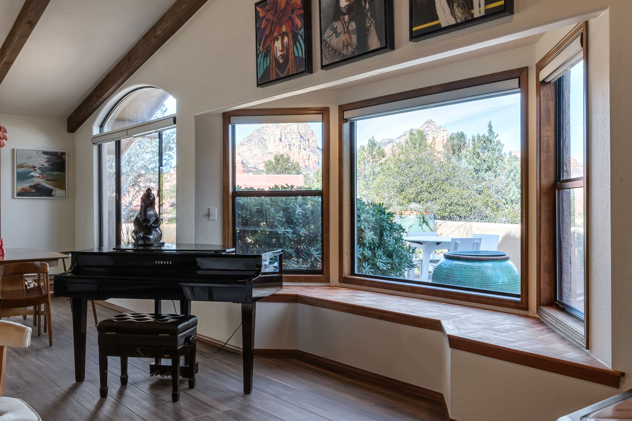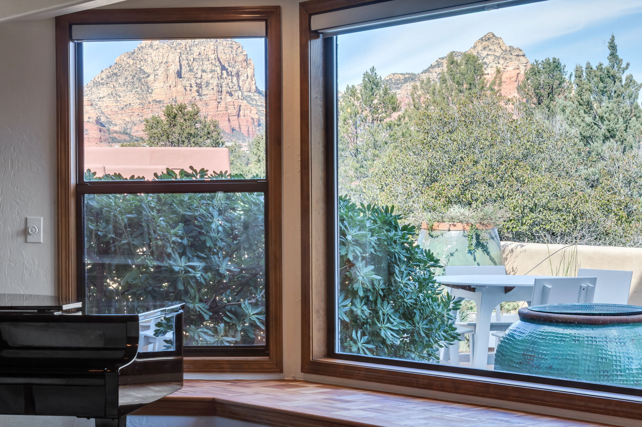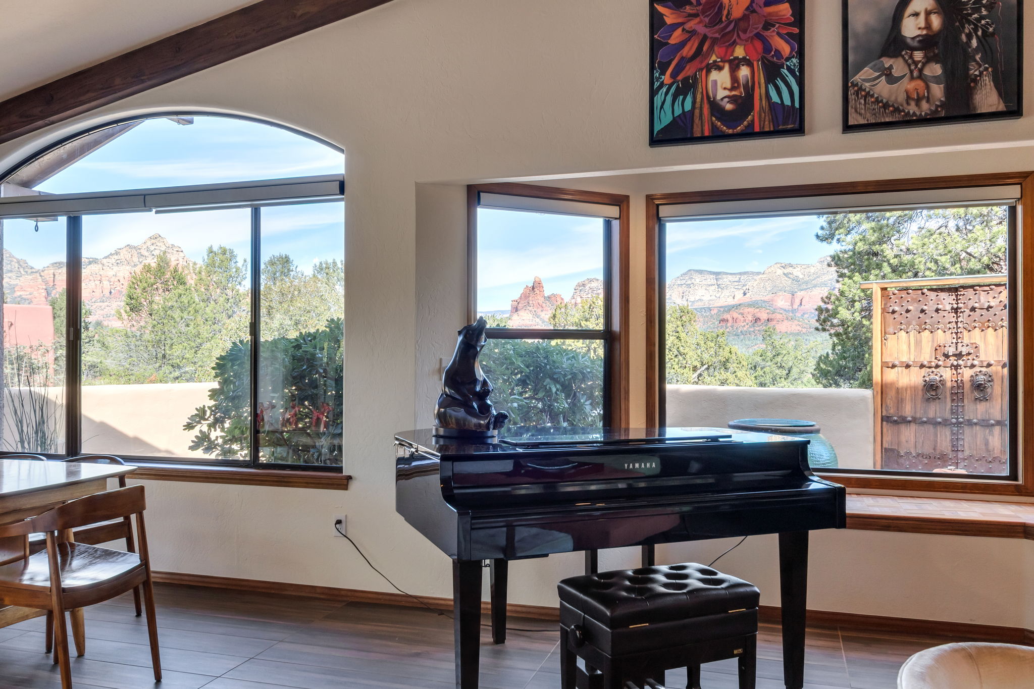 Natural light streams through an abundance of wood-cased windows and skylights, each thoughtfully oriented to frame the remarkable red rock formations of West Sedona. Throughout the home, sunlight and scenery become part of the interior experience, creating a seamless connection between indoors and the surrounding landscape.