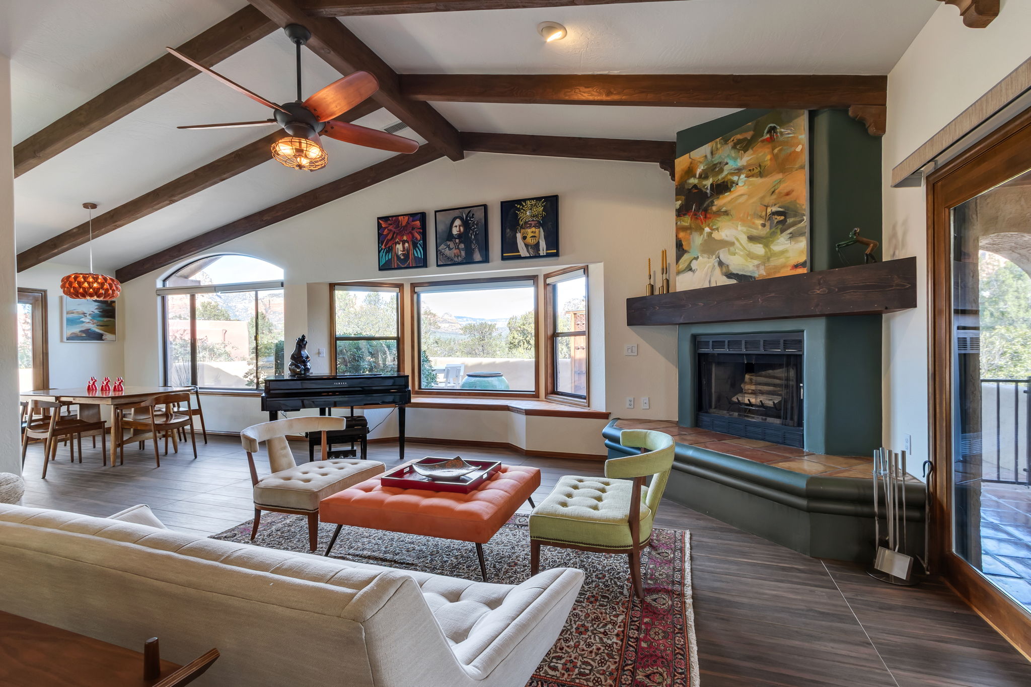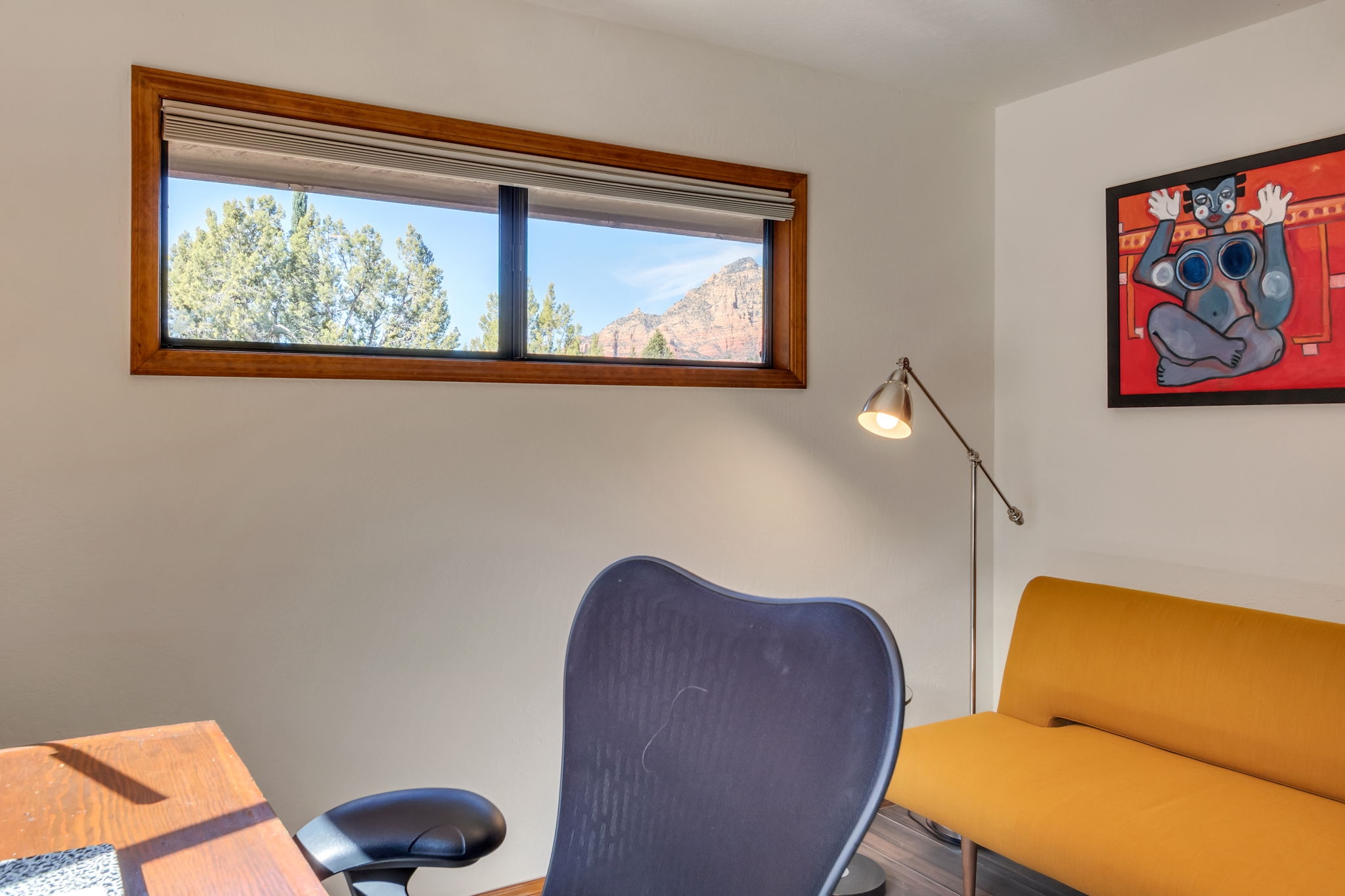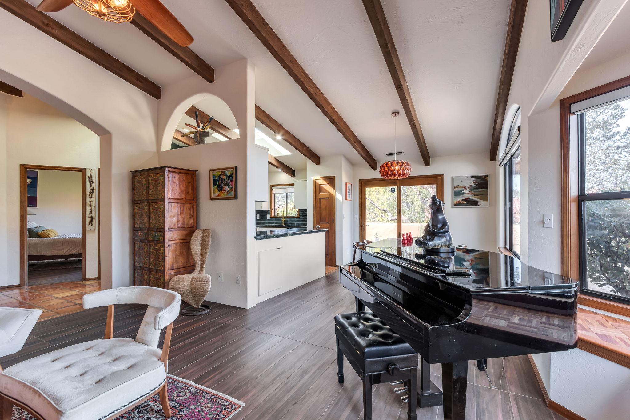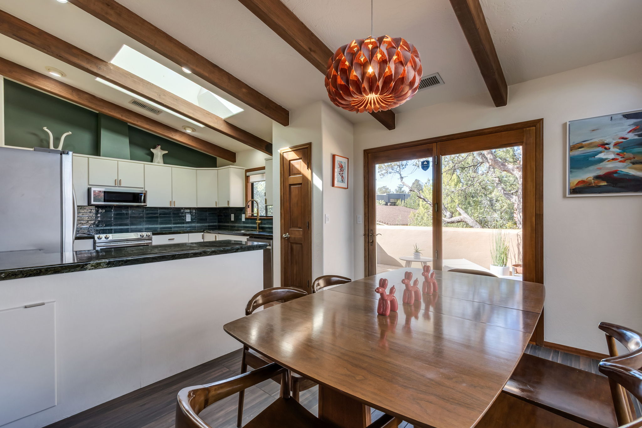 Natural light streams through an abundance of wood-cased windows and skylights, each thoughtfully oriented to frame the remarkable red rock formations of West Sedona. Throughout the home, sunlight and scenery become part of the interior experience, creating a seamless connection between indoors and the surrounding landscape.
