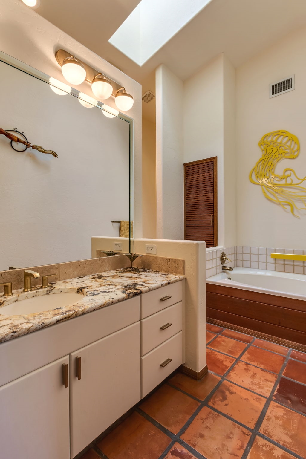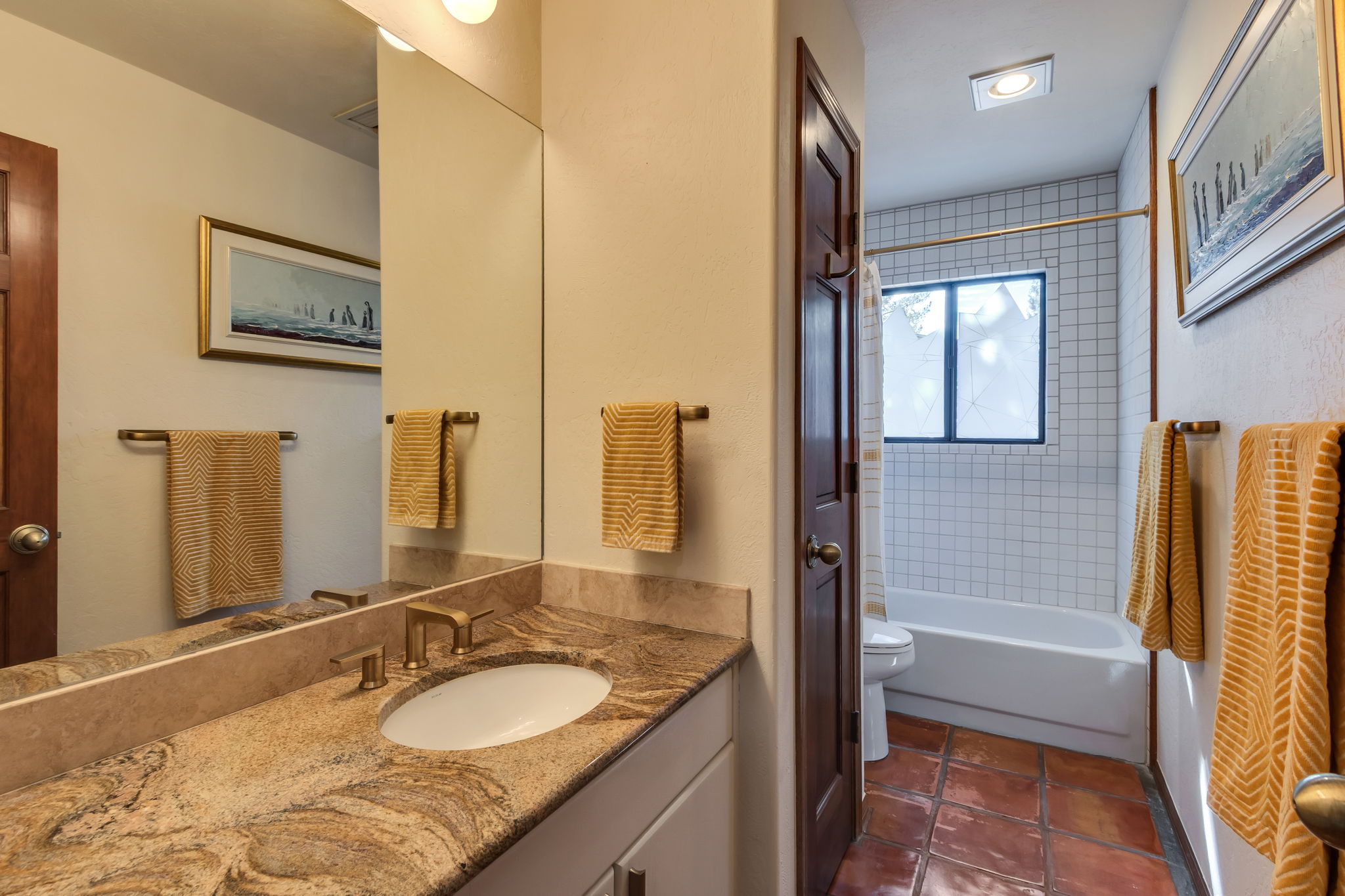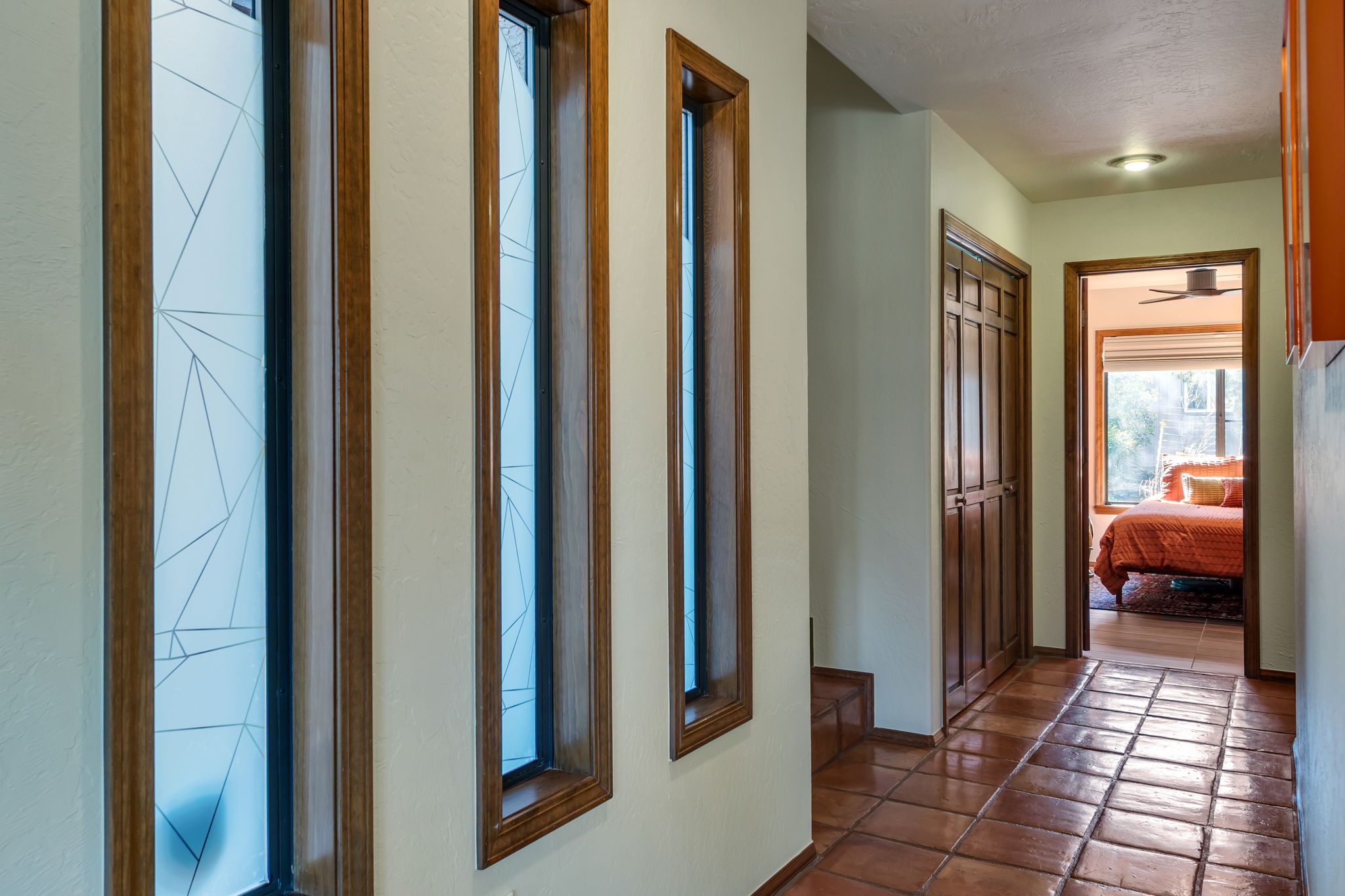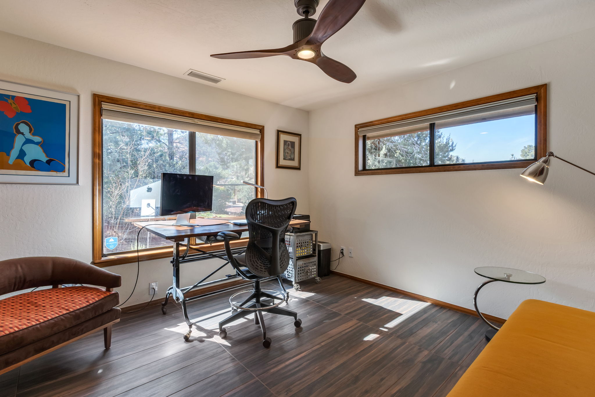 Natural light streams through an abundance of wood-cased windows and skylights, each thoughtfully oriented to frame the remarkable red rock formations of West Sedona. Throughout the home, sunlight and scenery become part of the interior experience, creating a seamless connection between indoors and the surrounding landscape.