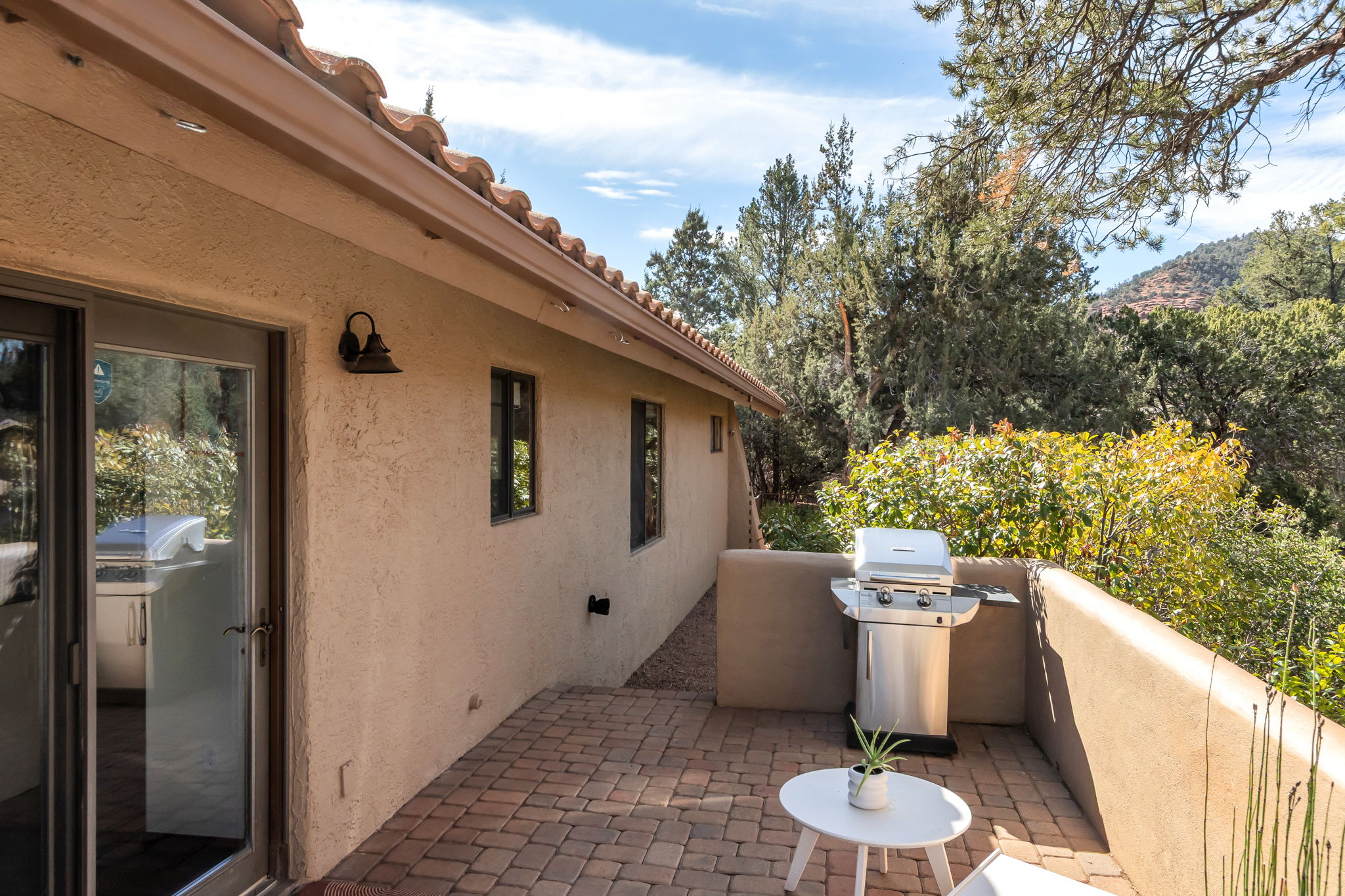 The living and dining spaces are designed for effortless flow and enjoyment, opening naturally to a wrap-around terrace that extend the home’s living areas outdoors. Whether entertaining guests beneath Sedona’s dramatic sunsets or enjoying a quiet evening under the stars, the indoor/outdoor design allows for year-round enjoyment of Northern Arizona’s exceptional climate. Every outdoor space offers a unique vantage point and sense of privacy, making the home equally suited for lively gatherings or peaceful retreat.