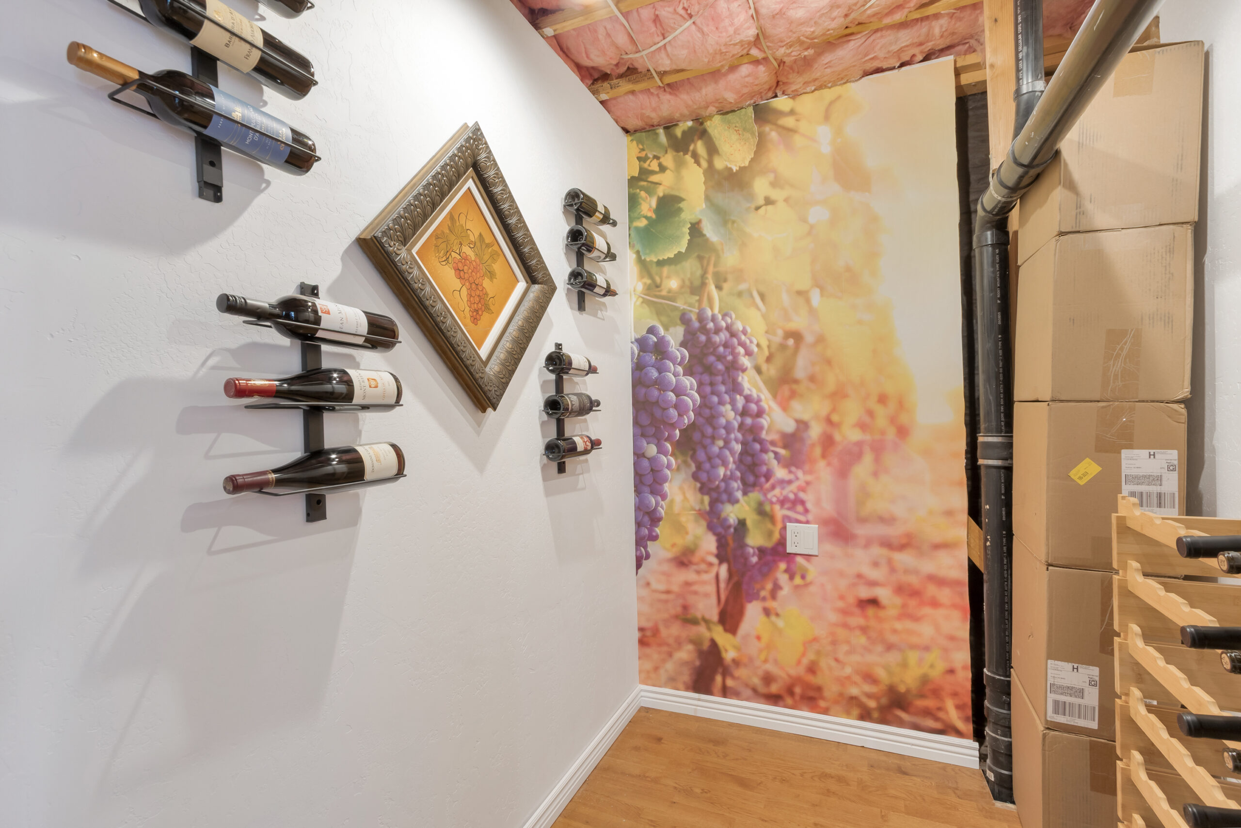 Practical luxury continues with a spacious two-car garage featuring custom storage systems, a craftsman workbench with shelving, and an additional dedicated bonus/storage room and wine cellar. A paver driveway accommodates up to four vehicles, with additional parking at the street entry for guests. A newer roof installed in 2019 with a 30-year warranty adds further peace of mind.